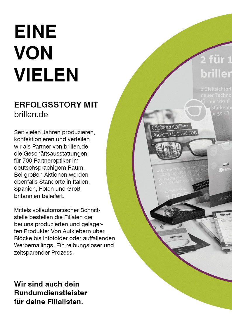 Du versorgst uns mit Daten aus deiner Kundenkartei, wie den letzten Kauf, Geburtstag oder Produktvorlieben und wir schicken abgestimmten Printprodukte (z.B. einen Angebotsflyer, für eine Zweitbrille) just in time an den entsprechenden Kunden.